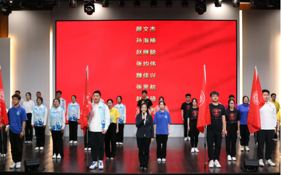 在歌曲《强国一代有我在》的旋律中,由社会实践团、青马学员、校园媒体联盟、学生总会、青年志愿者、缤纷社团等组成的青年团体上台,在飘扬的旗帜下,庄严宣誓,展现出城院学子青春阳光的精神风貌。