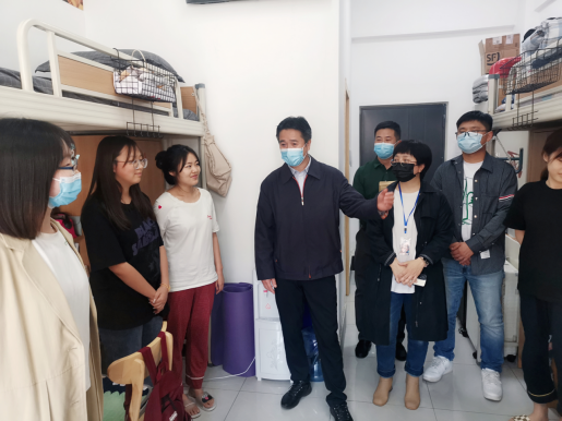 杨斌一行先后走访了9号宿舍楼、14号宿舍楼。在电子与自动化20级男生宿舍、英语20级女生宿舍,院领导与同学们进行了亲切交流,详细了解同学们的宿舍生活、线上学习情况及学习效果,听取同学们的诉求和建议。