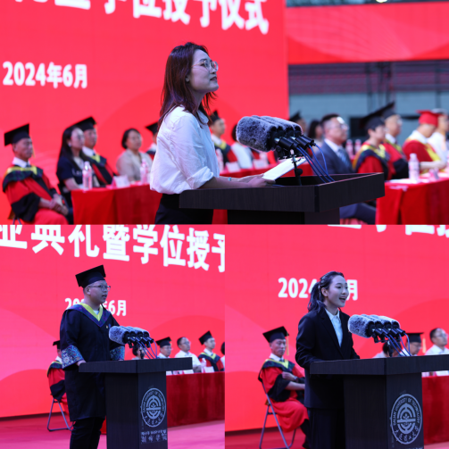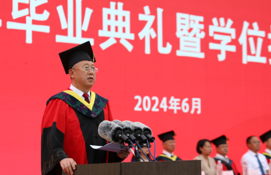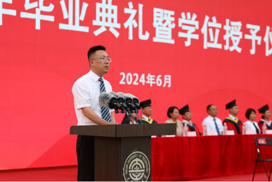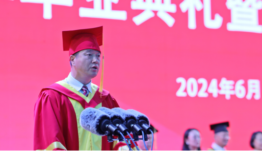 院长杨斌致辞。他从“坚定信仰,锚定目标,做有理想的新时代好青年”“读史明志,爱国忠诚,做敢担当的新时代好青年”“自信自立,直面困难,做能吃苦的新时代好青年”“勤而行之,躬身实践,做肯奋斗的新时代好青年”四个层面寄语毕业生。