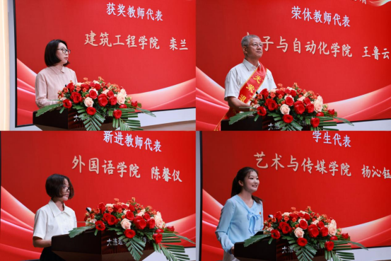 杨沁钰分别作为获奖教师代表、荣休教师代表、新进教师代表、学生代表在会上发言