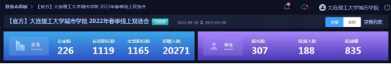 本网讯 3月30日,我院成功举办 2022年春季线上双选会,共有307名毕业生参会,其中188人共投递简历835份。近50名毕业生当场与用人单位达成初步意向。