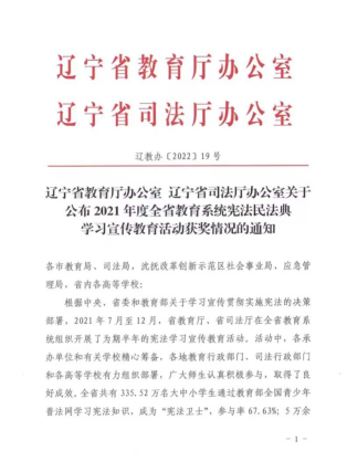 近日,由省教育厅、司法厅在全省教育系统组织开展的2021年度全省教育系统宪法民法典学习宣传教育活动获奖名单揭晓,我院荣获辽宁省教育系统"宪法卫士"行动计划优秀组织单位,我院计算机工程a片