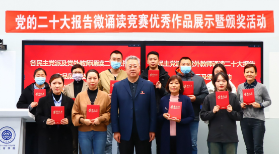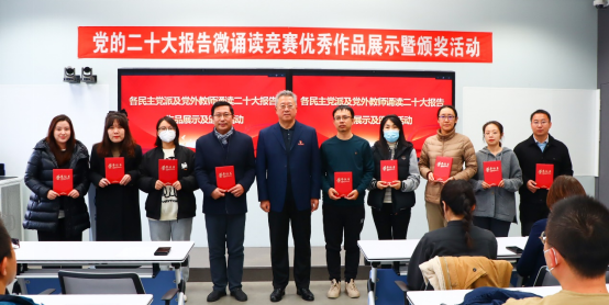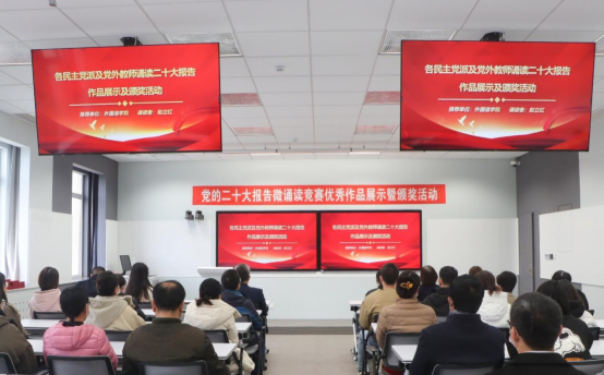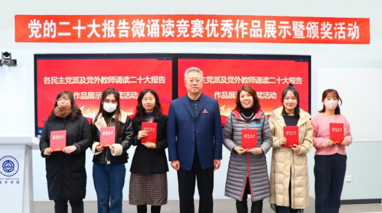 本网讯 11月23日,我院民主党派及党外教师党的二十大报告微诵读竞赛优秀作品展示暨颁奖活动在管理楼308智慧教室举行。党委书记郭玉铸、获奖教师代表和各部门统战联络员出席活动。活动由党委委员、统战部部长葛日波主持。