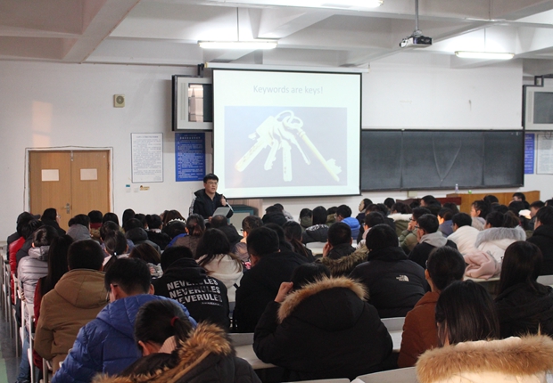 副院长宁强老师在实验楼JT401教室为我院2014级考生做考前心理调适与英语考试考前辅导讲座。本次讲座由外国语a片