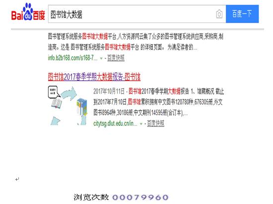 图书馆首次编写了《图书馆2017春季学期大数据报告》。报告从“馆藏概况”、“读者借阅”、“入馆行为”以及“电子资源”四个方面,以馆藏分布、分类借阅、入馆频次、读者排行、热门借阅、电子资源使用和论文发表数量为指标,客观详实地发布我院图书馆的馆藏情况、师生的阅读指数以及群体性偏好。《大数据报告》自9月发布以来,受到广泛关注,截至11月23日,在百度检索中点击率达到了79960次。