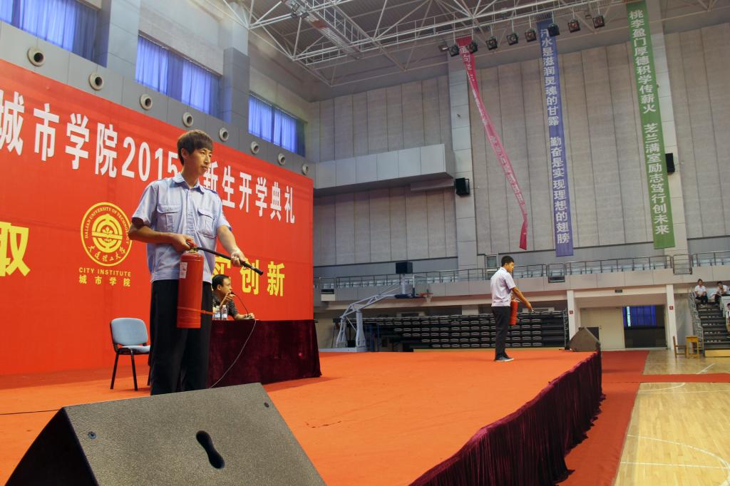 整场演习包括理论讲解和实战演练两个环节,借由新生入学安全教育之际,安全保卫部王大军主任向1600多名新生介绍了预防火灾的基本常识,灭火器的正确使用方法,火灾发生时的逃生自救方式,并向同学们展示和介绍了逃生疏散演练时的操作规范和注意事项。