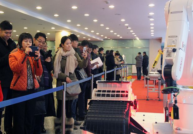 12月18日上午,我院图书馆学术报告厅前厅内人头攒动,热闹非凡,十几台不同类型的机器人在这里依次排开,向人们展示着自己非同凡响的高超技艺,无论是涂胶、打磨、打标,还是焊接、码垛、装箱,这些机器人总是默默无闻、毫厘不差地自动完成自己的任务。大连市300多名业内人士和我院部分师生员工有幸在这里一睹为快,大饱眼福。这是由今日机械(大连)有限公司举办的2014工业机器人应用技术推广展示会的一个场景。