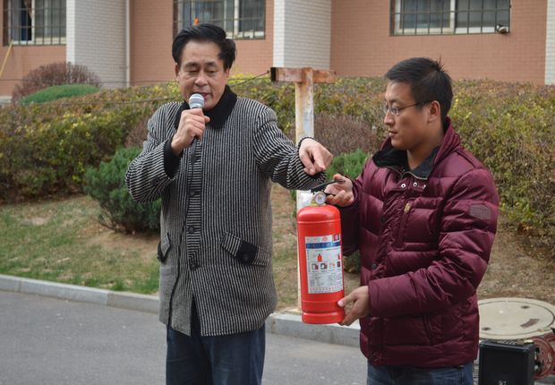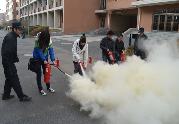 此次演习中,安全保卫部主任王大军就发生火灾时应注意事项及如何逃生等内容对参加演练活动的师生做了培训,同时,他还向同学们演示了干粉灭火器的使用方法并现场指导大家使用,5名同学亲身体验。安全保卫部的二名保安还分别演示了如何借助绳索多层逃生和隔层逃生方法。