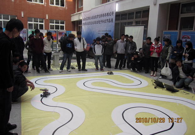 与大连海事大学等高校学生进行的智能车表演及电子科技作品展览。我院学生代表向在场观众介绍了我院智能车队的现状及最新进展情况。