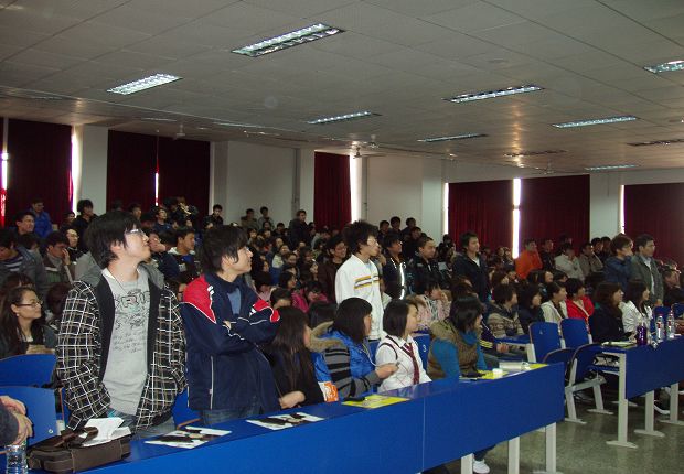 演讲中,笈川幸司老师以幽默风趣的语言和丰富多彩的实例,以其发明的“笈川小乐谱”的朗读方法为基础,向同学们讲述了日语口语学习的要点和技巧,引起了现场听众的共鸣,同学们也以极高的热情积极参与了现场提问等互动环节。约定2个小时的演讲时间很快就过去了,许多意犹未尽的同学依然围拢在笈川老师身边讨教日语学习问题。