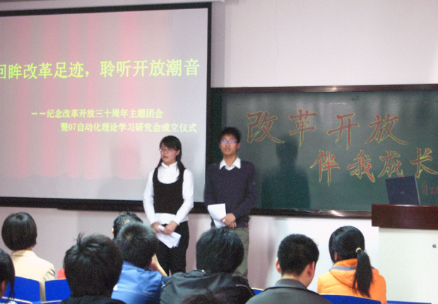 11月7日下午,自动化07级全体同学在教学楼1210教室隆重举行“改革开放伴我成长”主题团会暨自动化系理论学习研究会成立仪式。a片