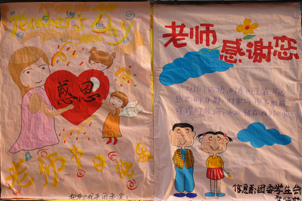 9月10日是我国的第24个教师节。清晨,当上班的老师一踏进校园,立即就被广告栏内那一幅幅祝福教师节的大幅海报和一张张贺信、贺卡所吸引;走近办公室,又都不约而同地在自己的办公室门上发现了一支支散发着缕缕清香的康乃馨和一张张饱含深情祝福的精美卡片;还有的同学为节日中的老师送去了花束、花篮和精心制作的贺卡,整个校园里到处都弥漫着浓浓的感恩情愫,处处都彰显出尊师重教的良好氛围。