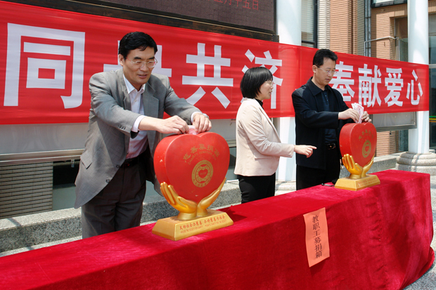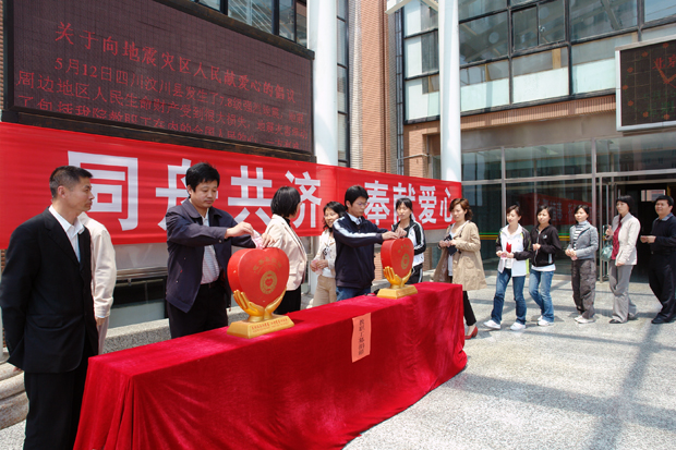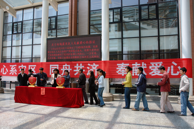 工会、团委、学生会等组织联合向广大师生发出倡议,号召大家为灾区群众渡过难关贡献一己之力。全院师生员工积极响应,迅速掀起为灾区人民送温暖、献爱心的热潮。在募捐活动中,许多大学生不仅在校内捐献,还通过手机捐款的方式给灾区人民送去了自己的爱心;大学生自强社成员都是家庭生活困难学生,他们也节衣缩食,为灾区人民捐款1800多元;我院的食堂、卫生所、超市、浴池、保洁等部门的员工也伸出援手,仅三个学生食堂就捐款7378元;部分外教也到募捐点捐献,表达了国际友人对我国抗震救灾工作的支持。