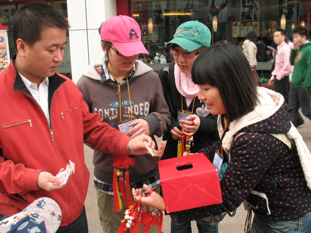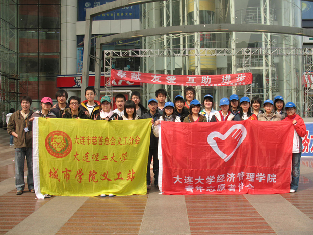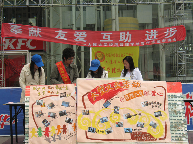 义工站50余名大学生们组成的义卖队,在开发区安盛购物广场门前开展了以“奉献、友爱、互助、进步”为主题的大型义卖活动,义卖的小工艺品都是由大连市甘井子区特殊教育中心的智障儿童亲手制作的。