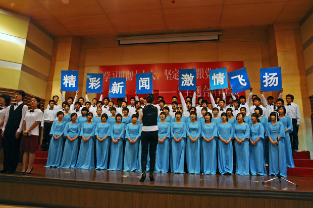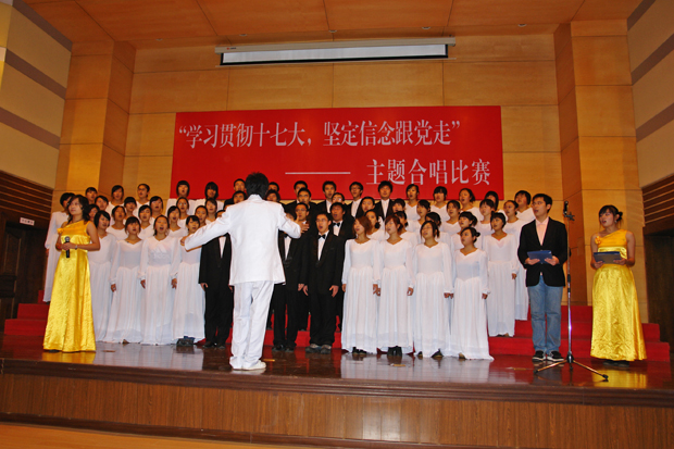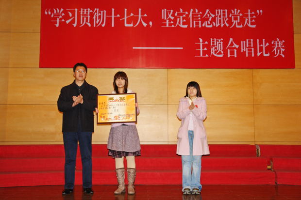 为了使当代大学生进一步加深对党的认识和了解,激发学生的爱国热情,掀起学习贯彻十七大精神的热潮,院团委于12月7日在图书馆报告厅举办了“学习贯彻十七大,坚定信念跟党走”主题合唱比赛决赛。院党委书记郭玉铸、院党委副书记兼副院长杨斌、院长助理兼学生指导部主任李宪起及有关院(系)、部门负责人观看了比赛并为获奖单位颁奖。