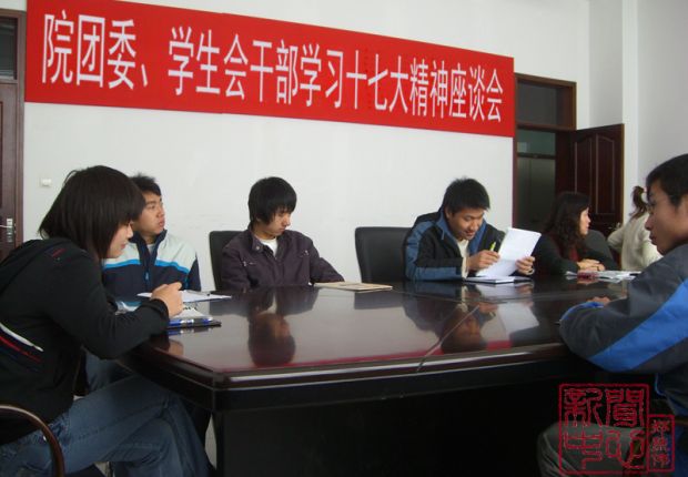 10月30日中午,院团委、学生会干部在教学楼一楼会议室召开学习十七大报告座谈会,共同学习、讨论十七大报告精神。