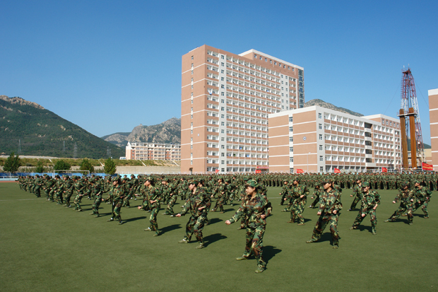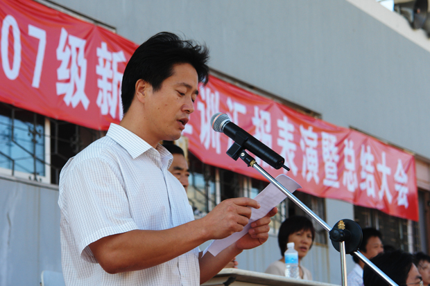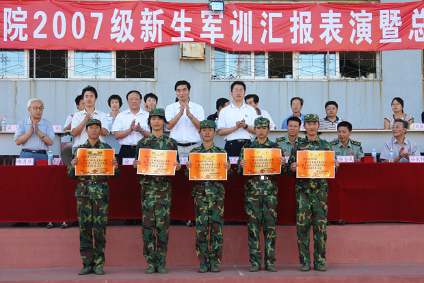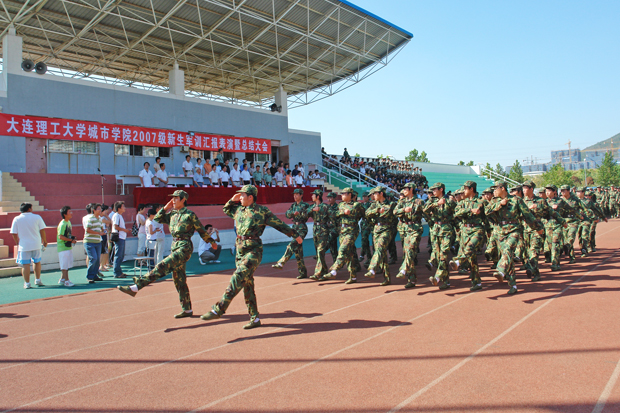 当天下午14:00,2007级新生军训会操表演暨总结表彰大会在体育场隆重举行。院长唐志宏、院党委书记郭玉铸、沈阳军区大连综合训练基地军训办主任于江上校、政委杨全城中校、副院长徐偱、杨斌、学生指导部李宪起主任以及各院、系负责人参加了大会。会议由a片