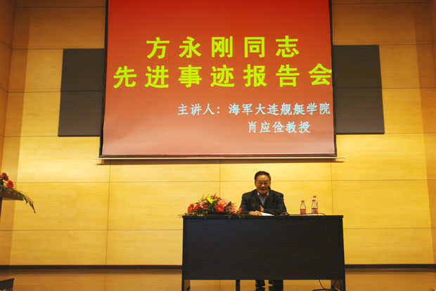 报告会上,肖应俭教授以方永刚战友的身份,向参加报告会的老师和同学讲述了方永刚的动人事迹。方永刚同志是辽宁省朝阳市建平县人,1963年出生,1985年复旦大学历史系毕业后即投身军旅。在22年研究和传播马克思列宁主义中国化最新成果中,方永刚同志深深地体会到:在当代中国,只有党的创新理论才能解决面临的发展问题,才是指引中国走向繁荣富强之路、人民过上和谐富裕生活的唯一正确的理论;党的创新理论是建设中国特色社会主义的科学指南,是实现国家发展、民族复兴的伟大真理。正是靠着这种坚定的信仰,他一直把学习、研究、传播党的创新理论作为自己最神圣的职责,看作是太阳底下最神圣的事业,当成自己生命中最重要的一部分。正是凭着对党的理论的坚定信仰,20多年来,他遇有理论困惑不动摇,碰到现实困难不回避,面对错误思潮敢斗争,在对真理的执著追求和坚决捍卫中,不断坚定对马克思主义的信仰,对中国特色社会主义的信念,对改革开放和现代化建设的信心,对以胡锦涛同志为总书记的党中央的信赖。