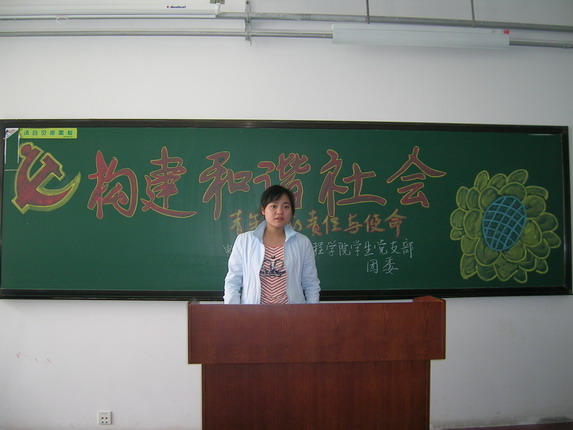 本次活动分为小组讨论及代表发言两个部分。各小组以“构建和谐社会与青年人的责任和使命”为主题,以重点解决为什么学习,为谁学习的思想问题为主线展开了深入讨论。讨论结束后,各小组代表在总结本组讨论结果的基础上做了典型发言。李禅同学认为构建和谐社会要注重构建人与自然的和谐,当代大学生要树立正确的世界观、人生观、价值观,诚信做人,为构建和谐社会贡献力量。王帅老师作为小组代表在发言中重点强调创建优良班风在构建和谐校园中的作用。他认为构建和谐校园首先要明确自身的学习目标,解决好“为谁学,为什么学”的问题,同时和谐的班风、寝风、班级干部的带头作用和团队精神是构建和谐校园的重要因素。冯丽娜同学指出,在构建和谐校园的过程中,同学们要做好“要我学”到“我要学”的态度转变,树立远大理想和抱负、明确当代青年人的责任和使命。