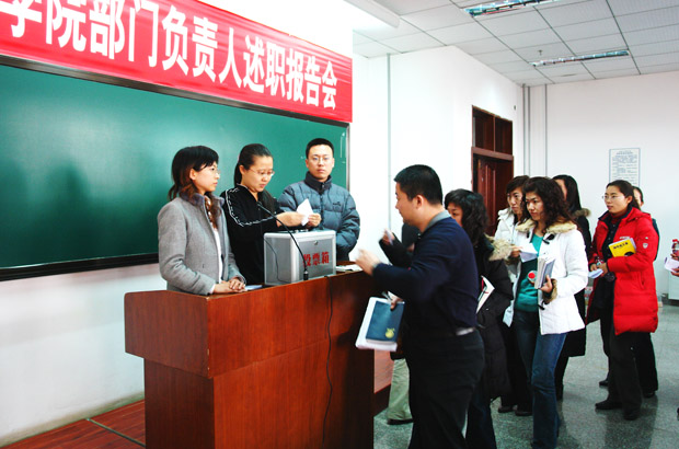 在教学楼1107室召开部门负责人述职报告会,各院(系)及机关、教辅部门30位负责人依次走上讲台,就各自部门和个人工作情况向a片