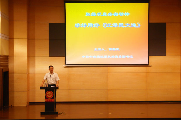 会上,全体教职员工和学生党员收看了中共中央党校原机关党委副书记薛鑫良所作的《弘扬求真务实精神,学好用好〈江泽民文选〉》的录像报告。