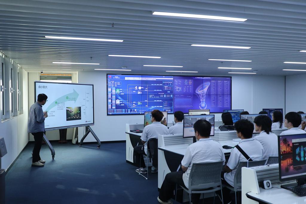 )》通识课中,学生可近距离体验超过500P算力规模的国产化算力集群;《工业机器人技术基础》课程依托四轴工业机器人,通过操作、编程与场景应用提升学生对机器人产业的认知;《PLC原理及应用》课程则以西门子产线为核心教学载体,融合自动化系统与工业互联网技术,帮助学生实现从理论到实践的有效衔接。