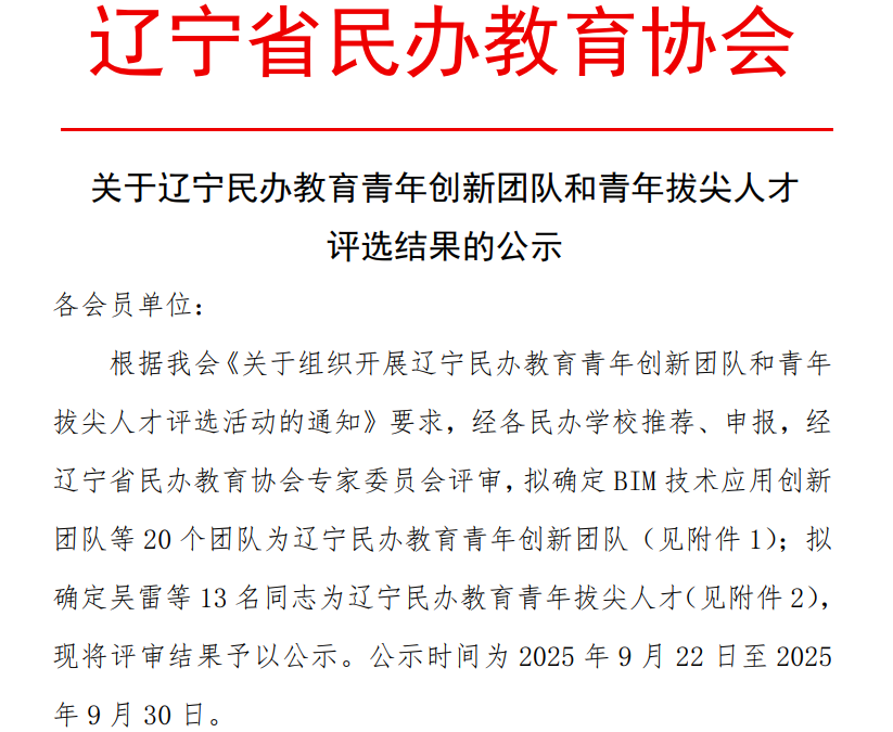 本网讯 9月22日,辽宁省民办教育协会公布最新评选结果,我院栾兰老师领衔的“城乡宜居环境研究创新团队”获评“辽宁民办教育青年创新团队”。许明明老师当选“辽宁民办教育青年拔尖人才”,实现人才与团队建设双突破。