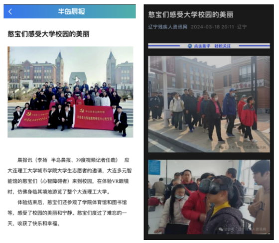 的各个角落,感受了大学校园的浓厚学术氛围。此次活动,不仅让星宝们感受到了社会的关爱和温暖,更是不断提升参与学雷锋志愿服务活动的积极性与主动性的重要体现。本次活动获得社会的广泛认可,先后被大连广播电视台新闻综合广播、半岛晨报(电子版)及辽宁残疾人资讯网报道。