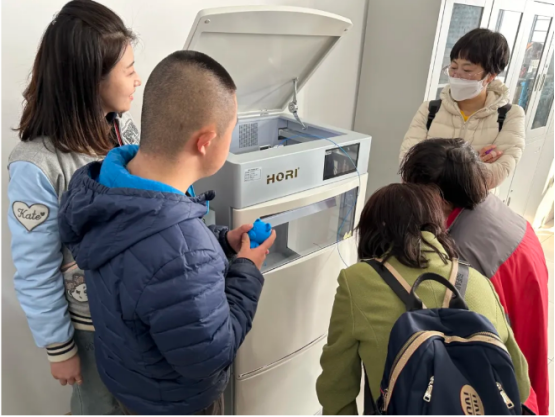 在体验3D打印机环节,工程实践中心的老师们耐心地为孩子们讲解3D打印的原理、操作流程。孩子们兴奋地围在一起,观察设计图纸通过材料的层层堆积,逐渐形成了不同样式的立体实物。