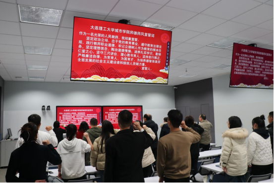 与会教师在刘丽娟的带领下,进行师德师风宣誓